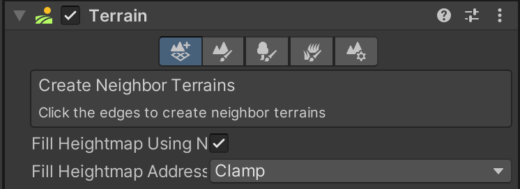 This tool lets you create additional neighboring Terrain objects that connect together like tiles. Starting with a small terrain size means we can add tiles in smaller workable chunks rather than an overwhelmingly huge landscape.
