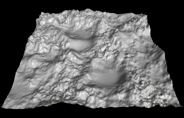 This same 2D image would be interpreted as this 3D landscape when used as a height map.