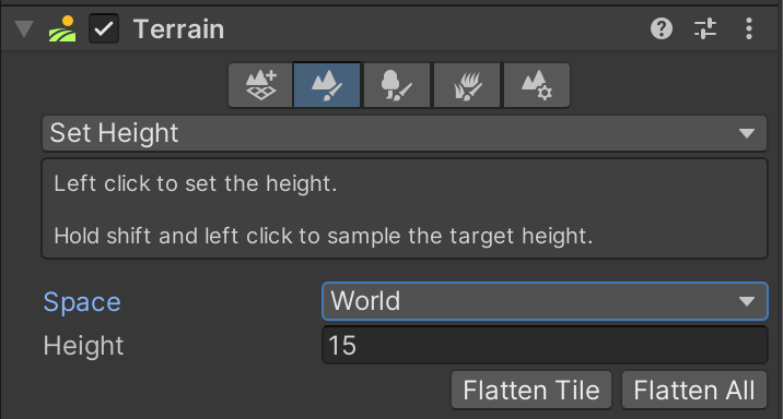 Currently, our landscape is represented by a completely black heightmap. This means the altitude of every point is at zero. We cannot lower the terrain any farther because you can't have negative values in a heightmap. In order to give us room both to raise terrain upward but also dig downward, we are going to reset the height of our entire terrain to 15. Using the "Set Height" tool, specify a height of 15 and click "Flatten Tile" to raise the tile to this value. Notice how your Terrain in the Scene view updates accordingly.