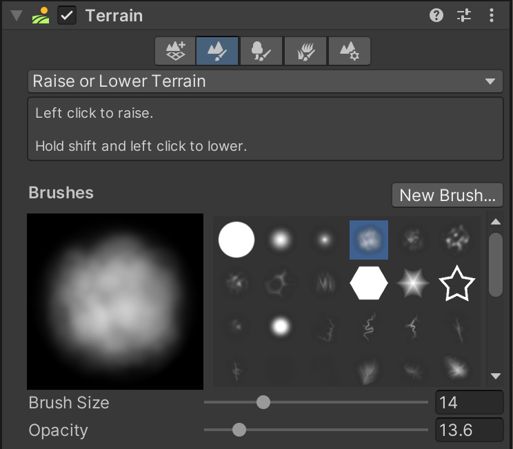 Using the "Raise or Lower Terrain" tool, experiment by selecting a variety of Brush shapes, sizes, and opacities and clicking/dragging on the Terrain object in the Scene view.