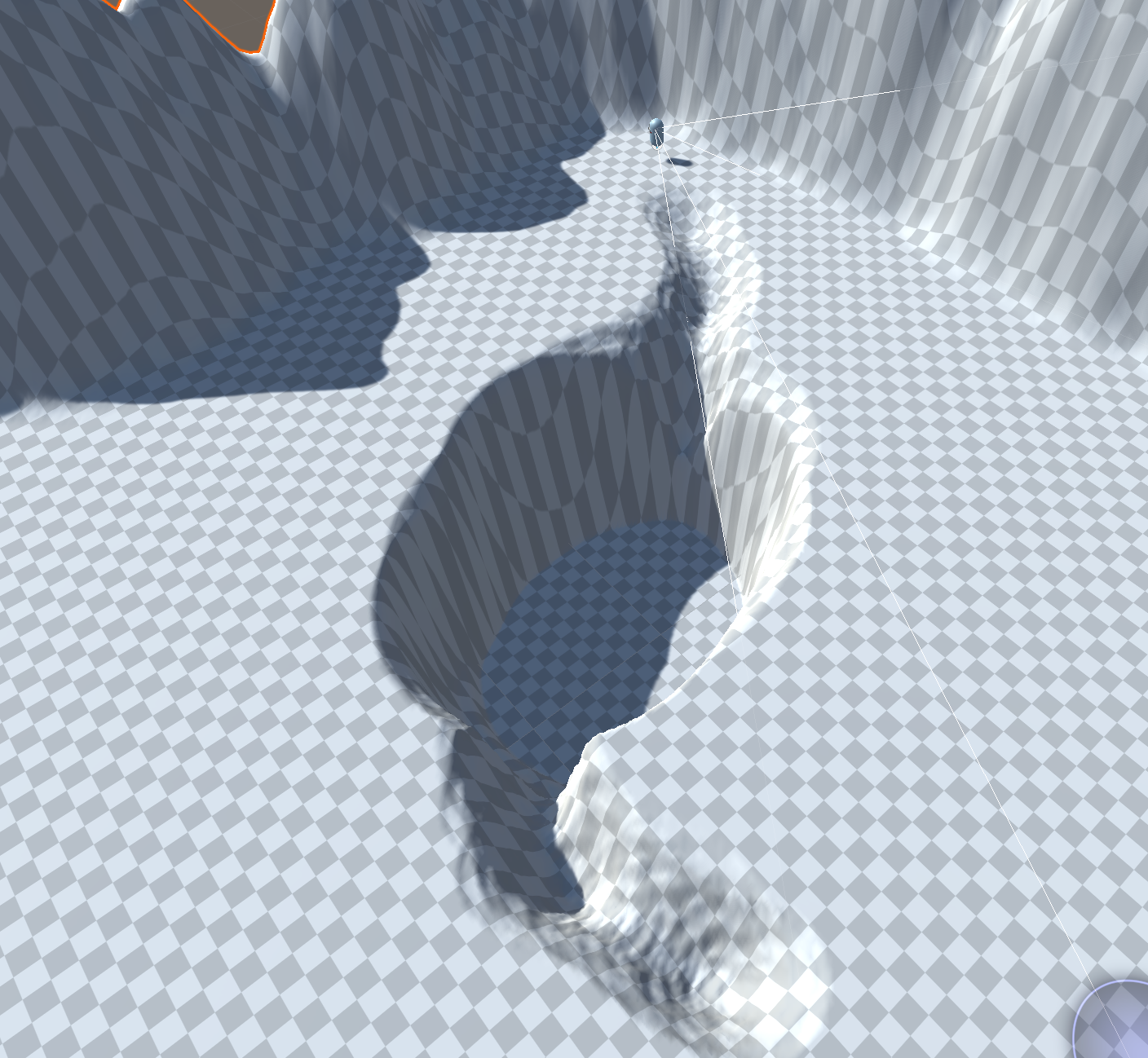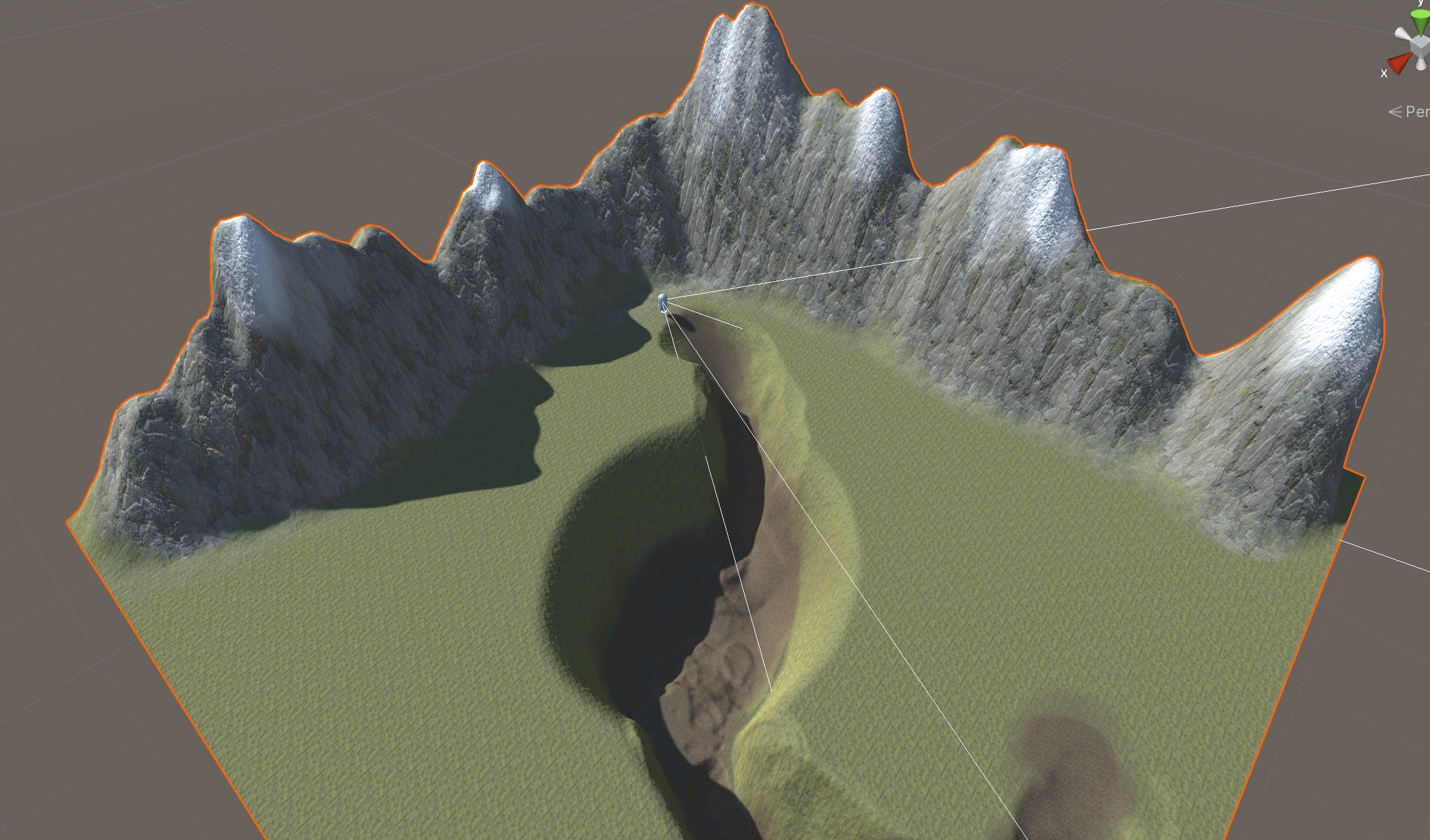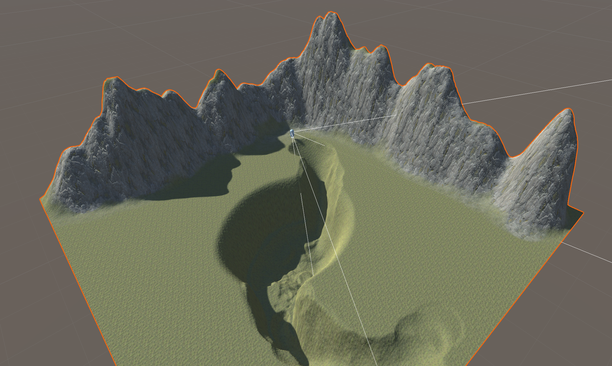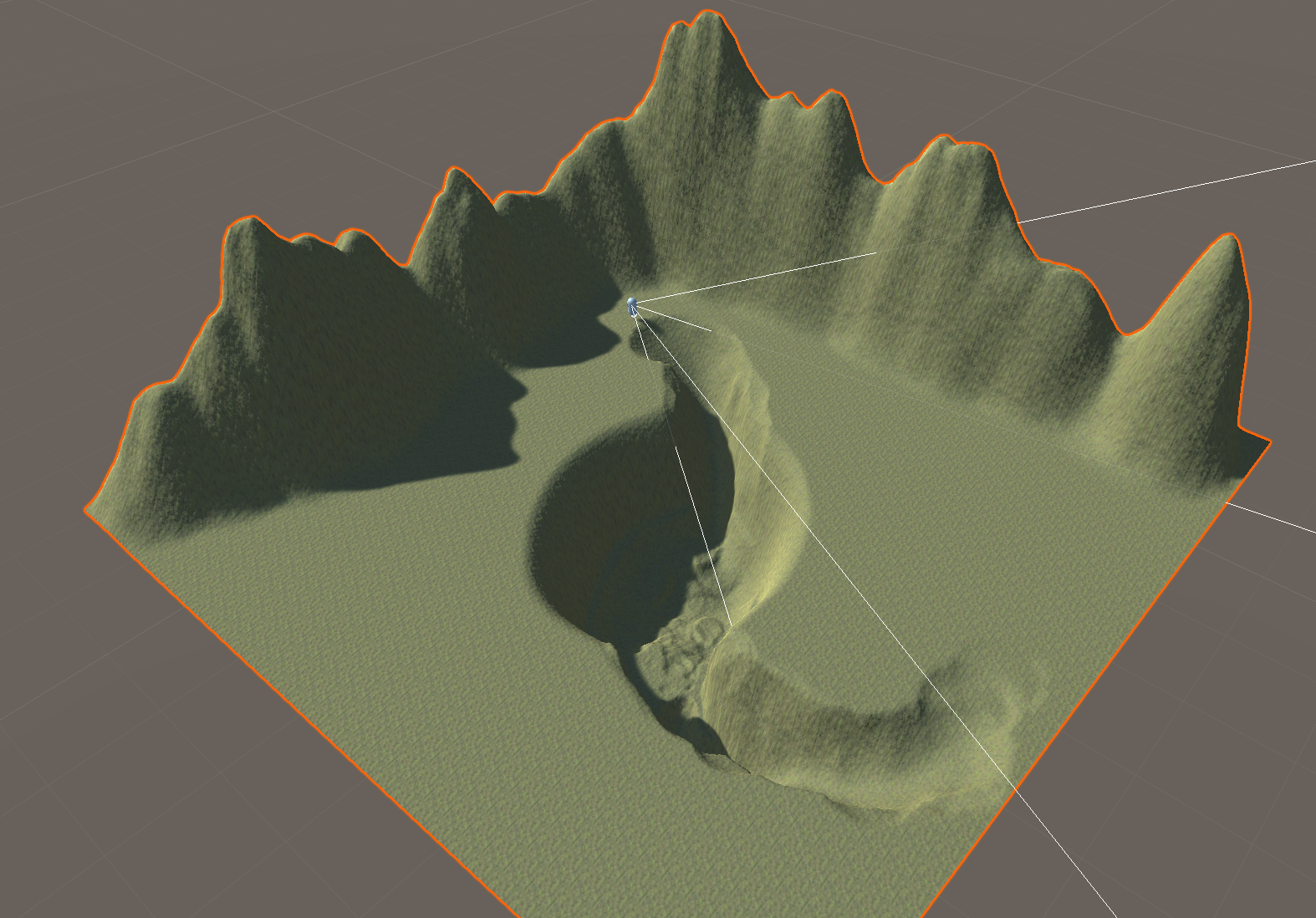Upon playtesting though, you might find that your landscape is not as smooth or as navigable as you expected. You will need to make revisions until it is actually usable by the player. In this example, what looked like a smooth path into the basin is actually very bumpy and includes a drop that is too sharp and dangerous the player.
