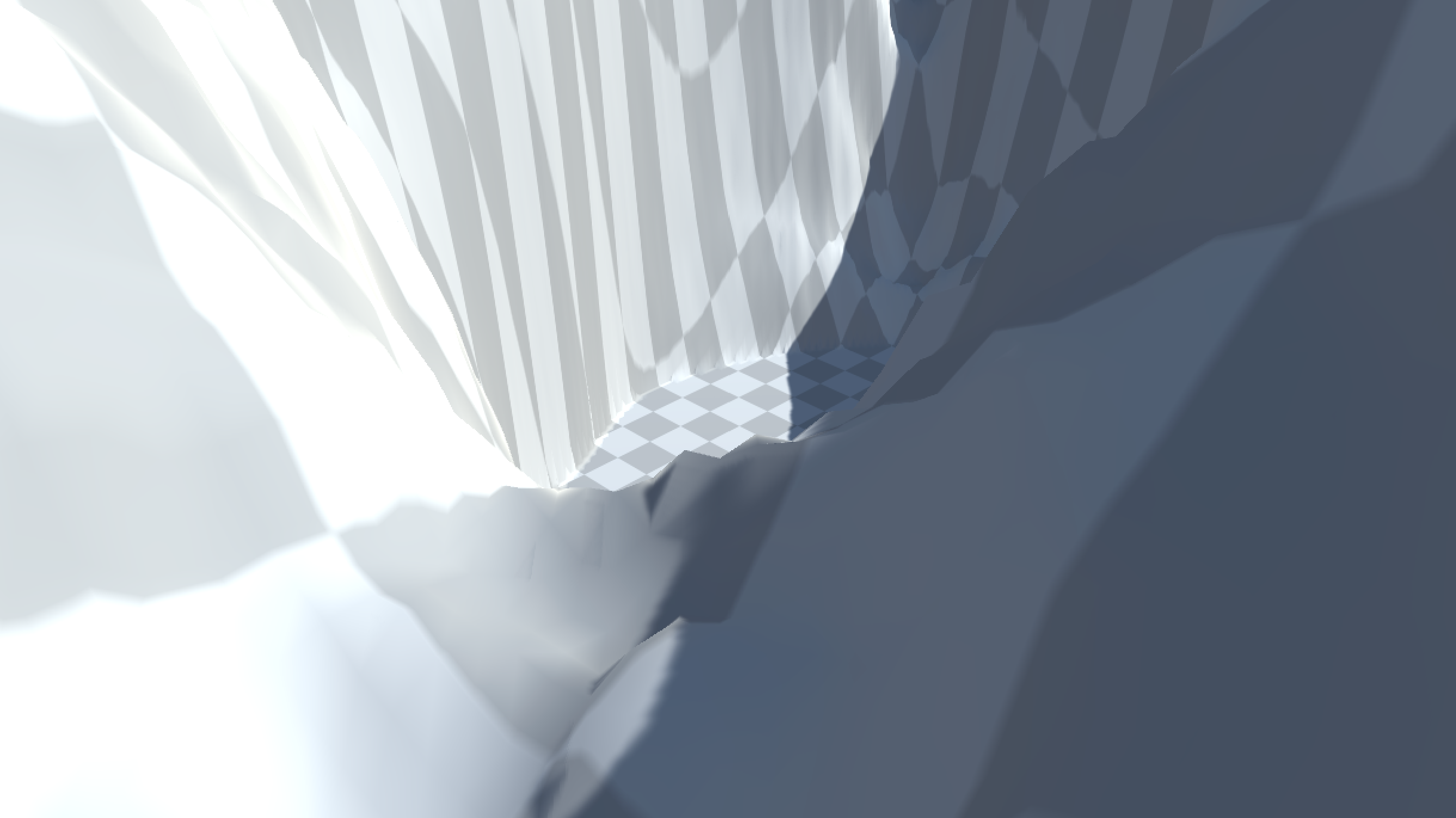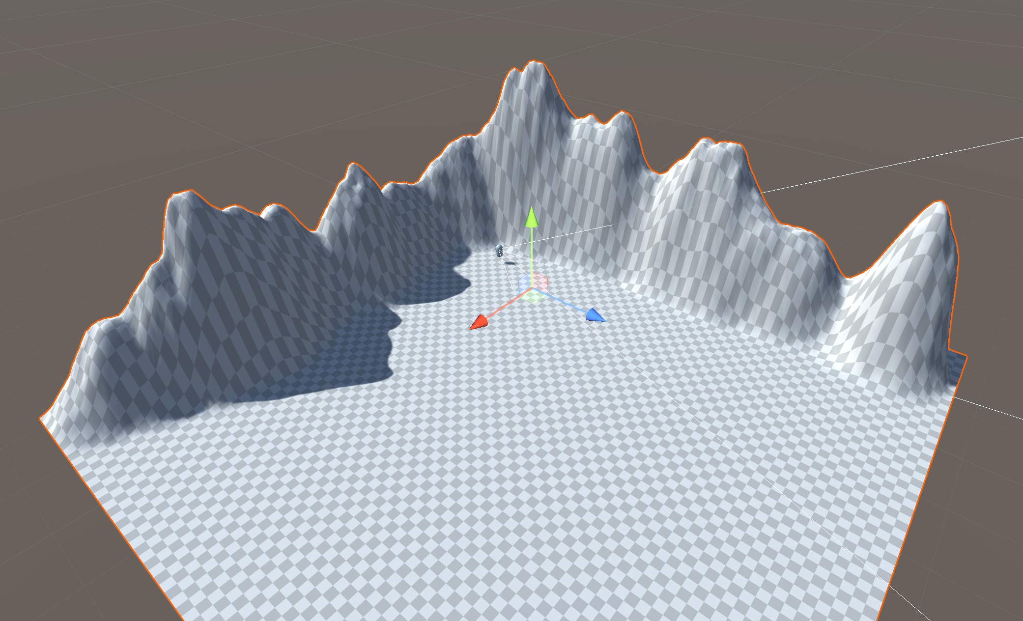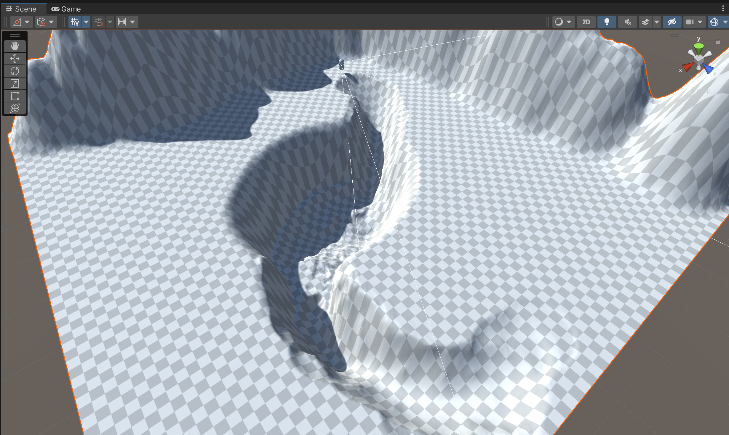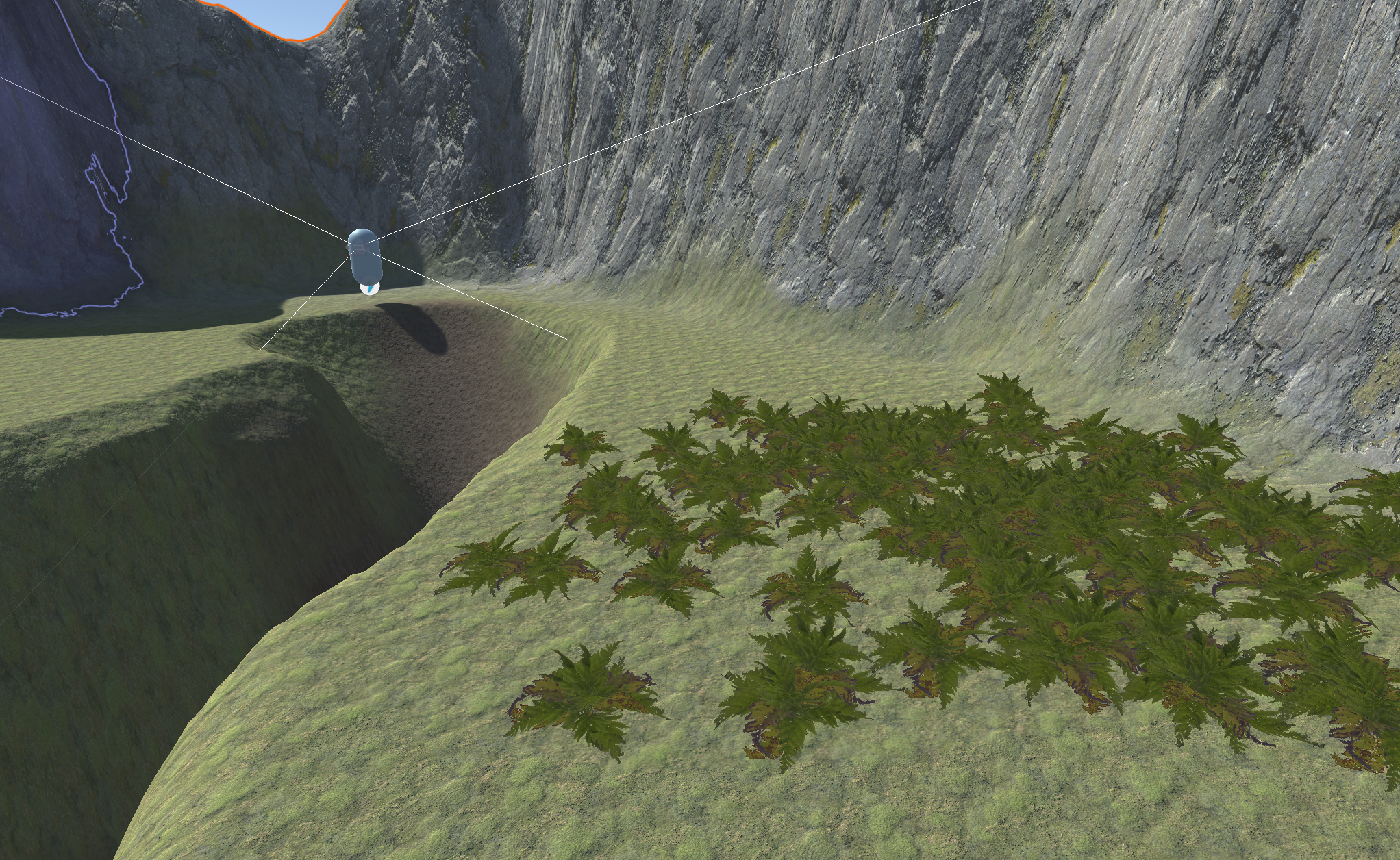 Upon playtesting though, you might find that your landscape is not as smooth or as navigable as you expected. You will need to make revisions until it is actually usable by the player. In this example, what looked like a smooth path into the basin is actually very bumpy and includes a drop that is too sharp and dangerous the player.