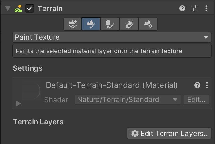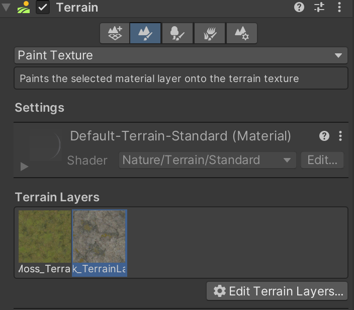Adding color to the landscape is a way to create visual distinctions that can be both visually appealing and also functional in guiding the player. You are required to use at least two texture layers in this assignment. Texturing is handled by the second tool in the Terrain component using the "Paint Texture" mode.