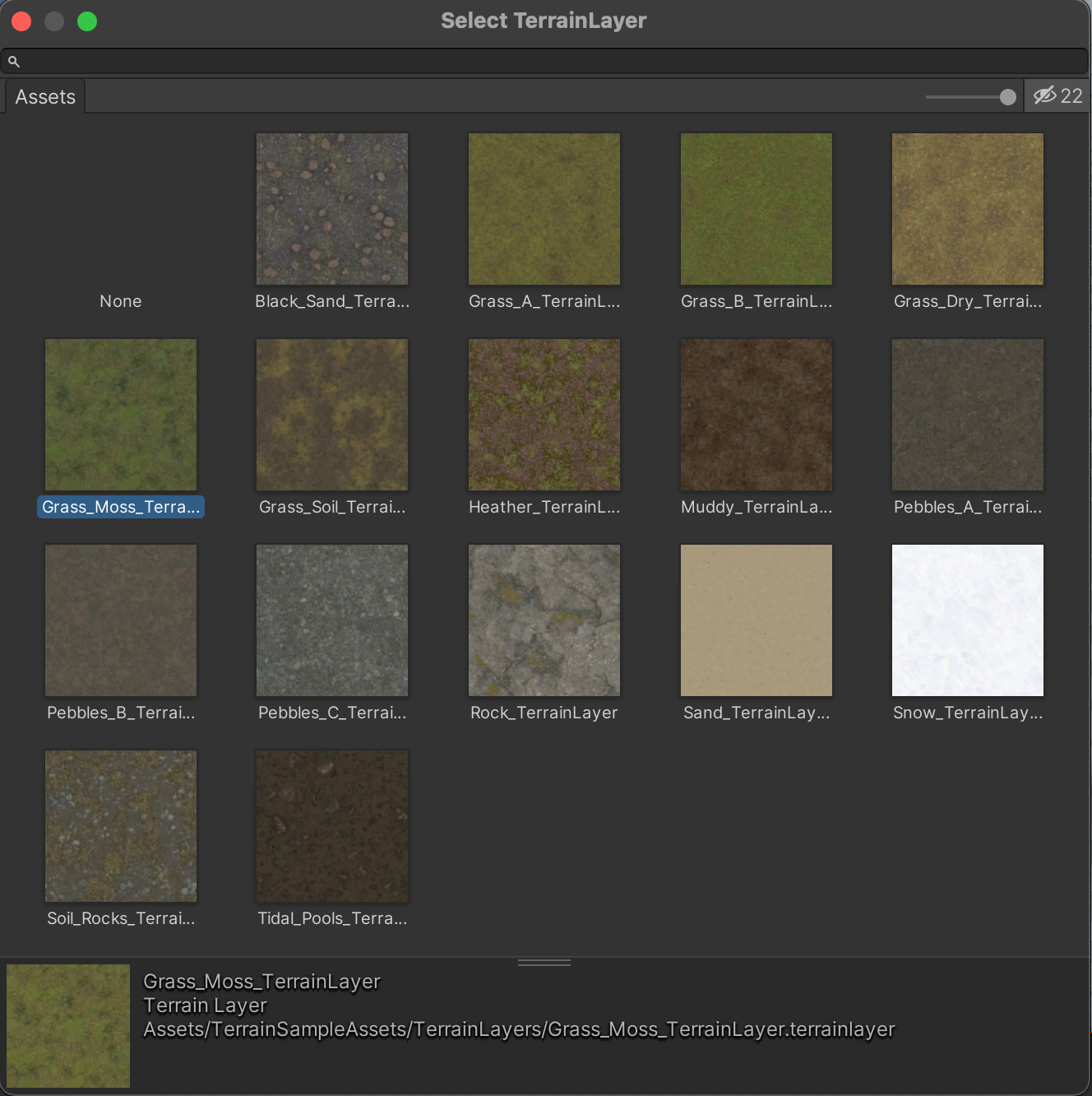 Clicking "Edit Terrain Layers" and "Add Layer" will reveal a few pre-made layers you can select. These came with Unity's Terrain Asset Pack we installed in a prior step. Double-clicking one of these options will create your first terrain layer and paint it across the entire landscape by default.