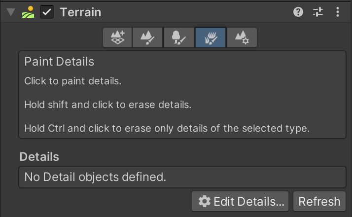 Terrain can include details such as trees, bushes, and grass. The Unity Terrain Asset Pack did not include any trees, so we will add foliage instead. (Both tools work very similarly.) The fourth Terrain tool is "Paint Details," and it allows you to add grass objects to the landscape without having to place dozens of models by hand.