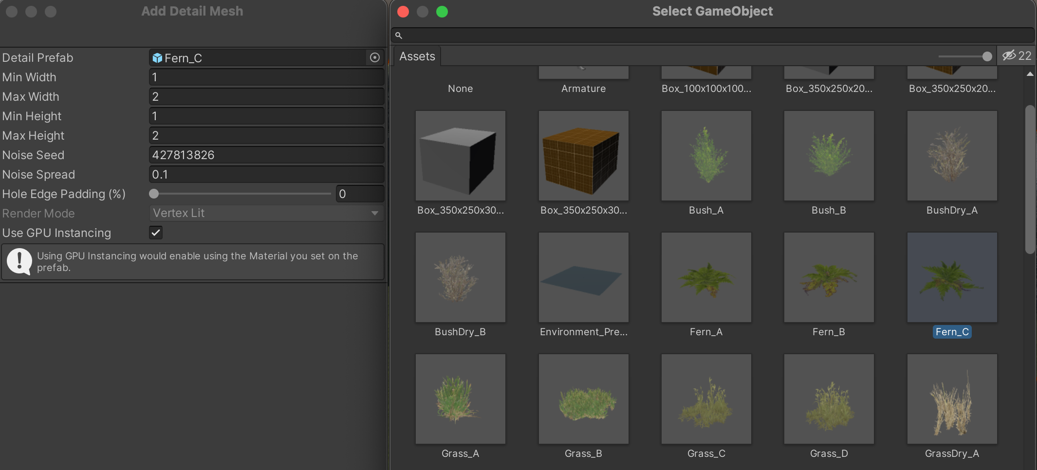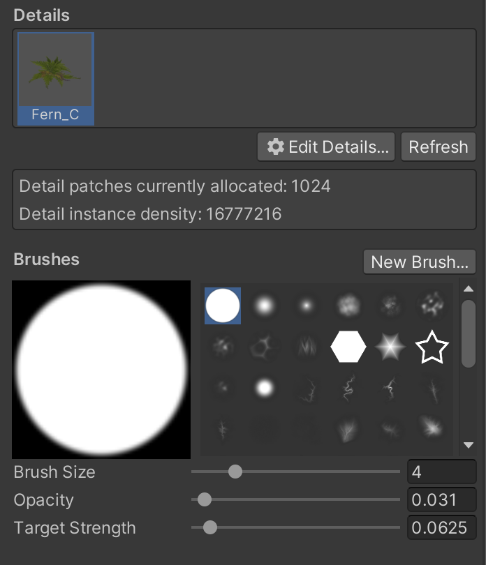 Similar to building your "Terrain Layers" list, you will need to create a list of "Terrain Details." Click "Edit Details" and "Add Detail Mesh." Select a detail foliage of your choice and finalize with the "Add" button.