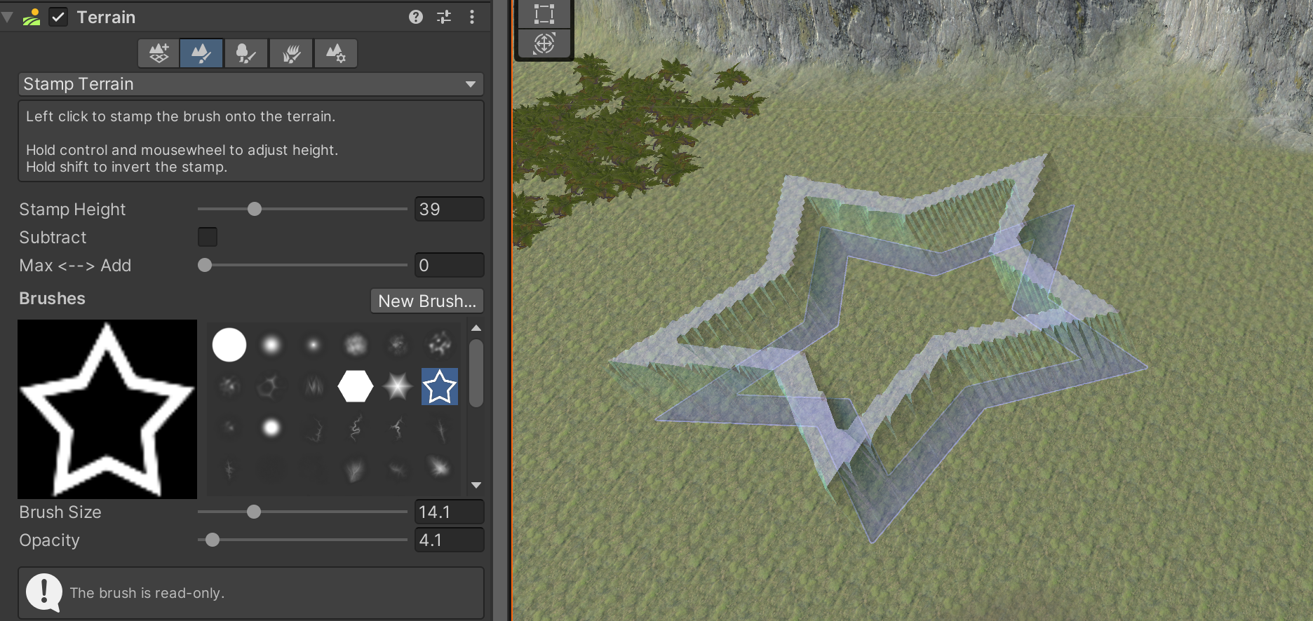"Stamp Terrain" is a mode found under the second Terrain tool. It allows us to imprint the shape of a brush onto the terrain.