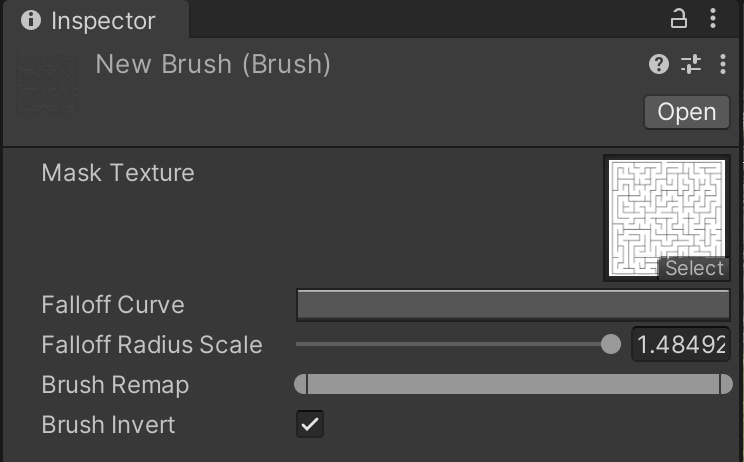 To fix the faded edges, Inspect the new brush. Alter the Fallof Curve to be a flat value of 1. (You can use the flat template at the bottom or drag the handles yourself.) Because this image uses black lines to represent walls, but black represents 0 altitude, I will also select "Brush Invert" to reverse which colors represent height.