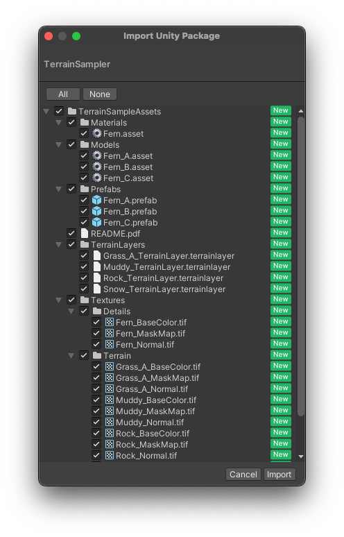 This package is a small portion of Unity's "Terrain Sample Asset Pack" which we will use to create our landscape. The full pack is around 2GB and much too large for classroom purposes. To keep project size under control, I have provided a smaller package with only the necessary assets. If you would like to use the full asset in your own personal projects it can be found at https://assetstore.unity.com/packages/3d/environments/landscapes/terrain-sample-asset-pack-145808.