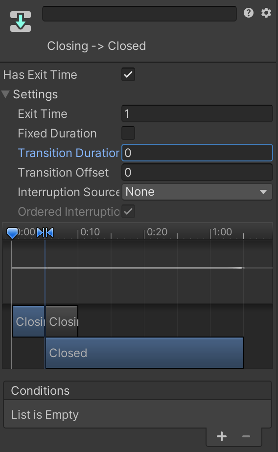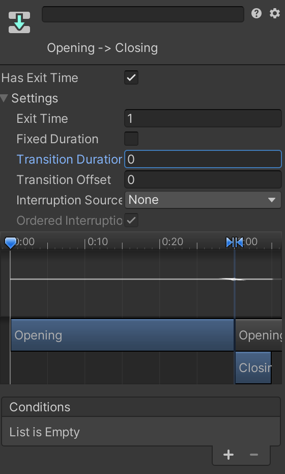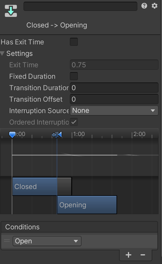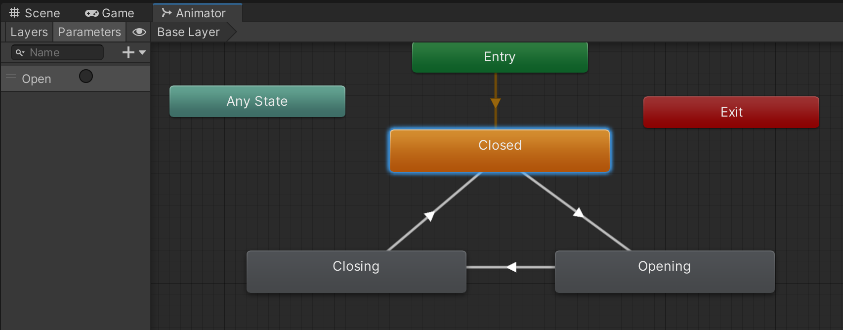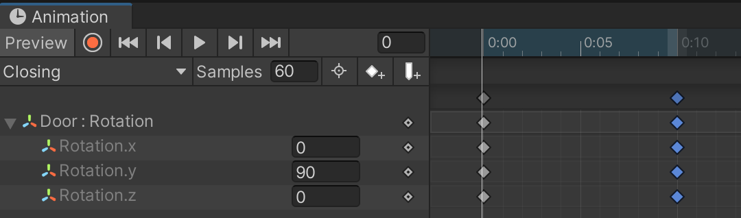 We will need three animations for our Door interactions: Closed, Opening, and Closing. (Notice how there is no dedicated "Open" animation. The door will remain open for a limited time during the end of the "Opening" animation.
