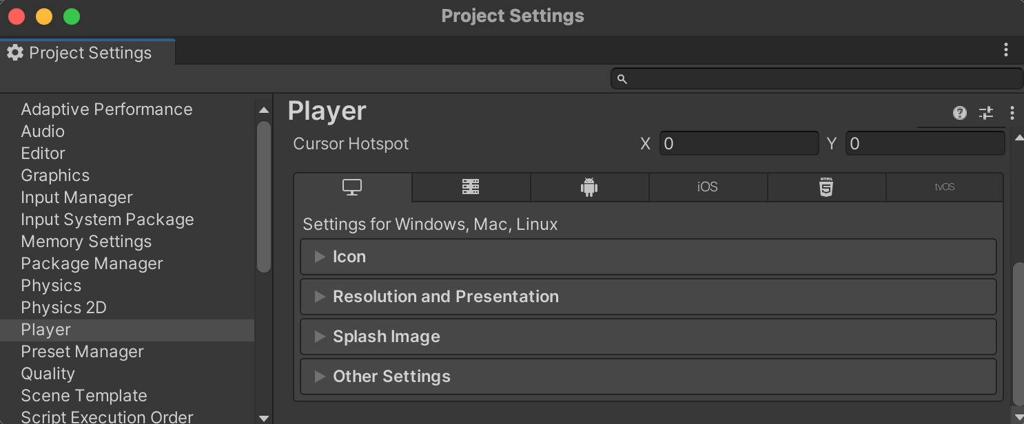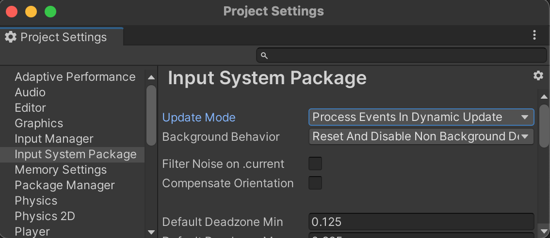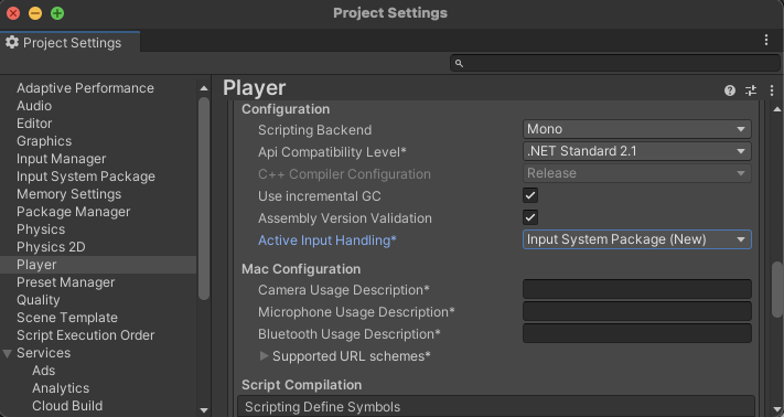 When we installed Unity's Character Starter Pack, we also switched the project to Unity's new input system which enables more advanced input configuration. We will be learning more about this system in a future assignment. For now, we will access the new input system directly via code instead of using the configuration tool. First, confirm that the new input system is active in your project by opening Edit > Project Settings > Player.