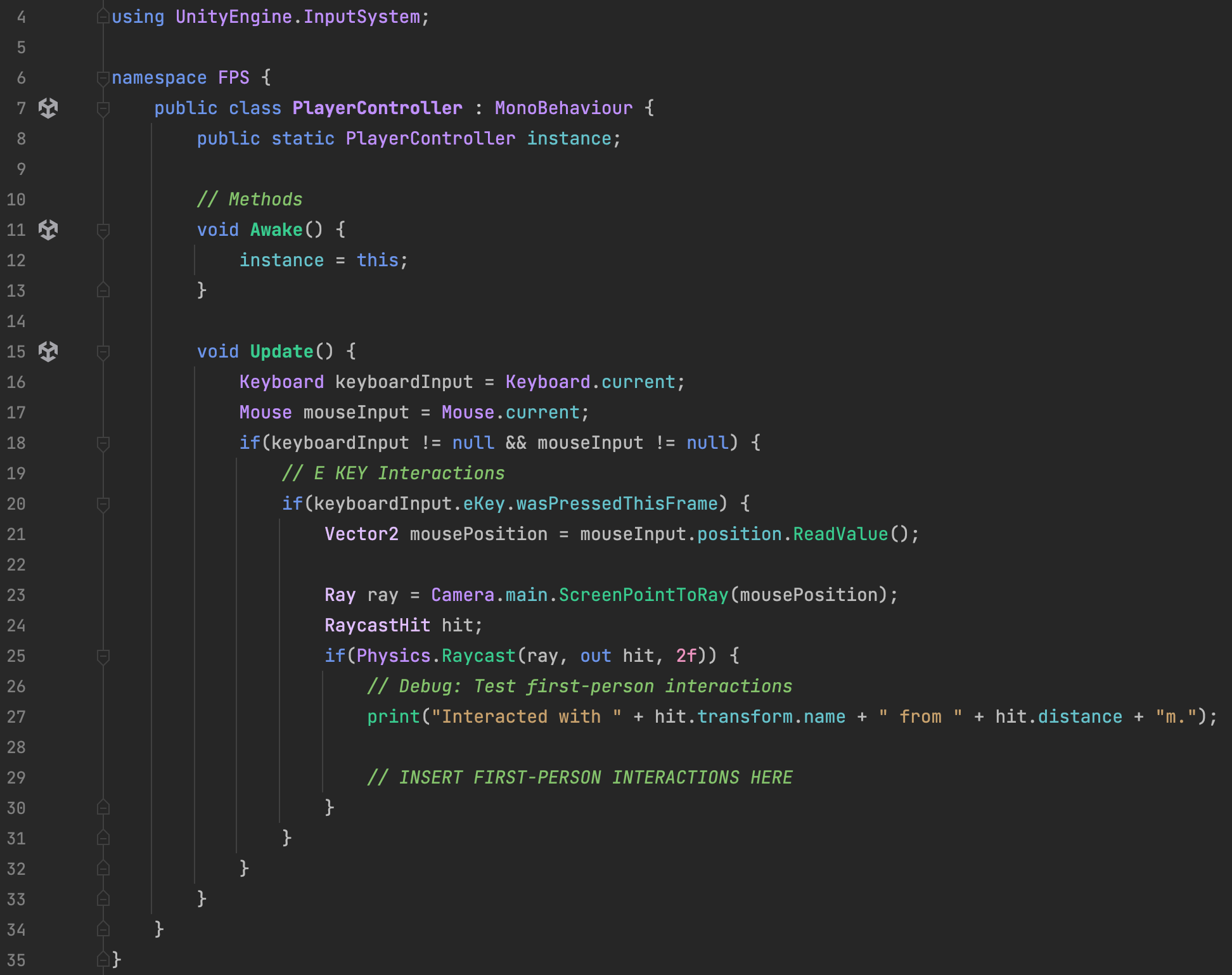 The PlayerController will respond to the E key by raycasting a short distance in front of the player's gaze to trigger interactable objects. Think of this as the player interacting with objects within arm's reach.