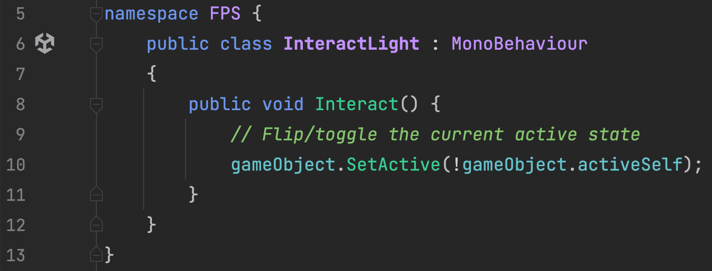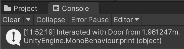 Test your code: Play the game, walk up to the door, and press E. Your debug console should say that you have tried to interact with the door. Test other objects and note the results.