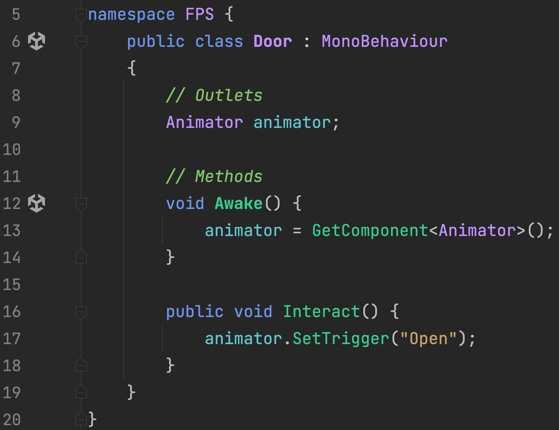 Back in the Door script, add a public Interact function that triggers the door's animation cycle.