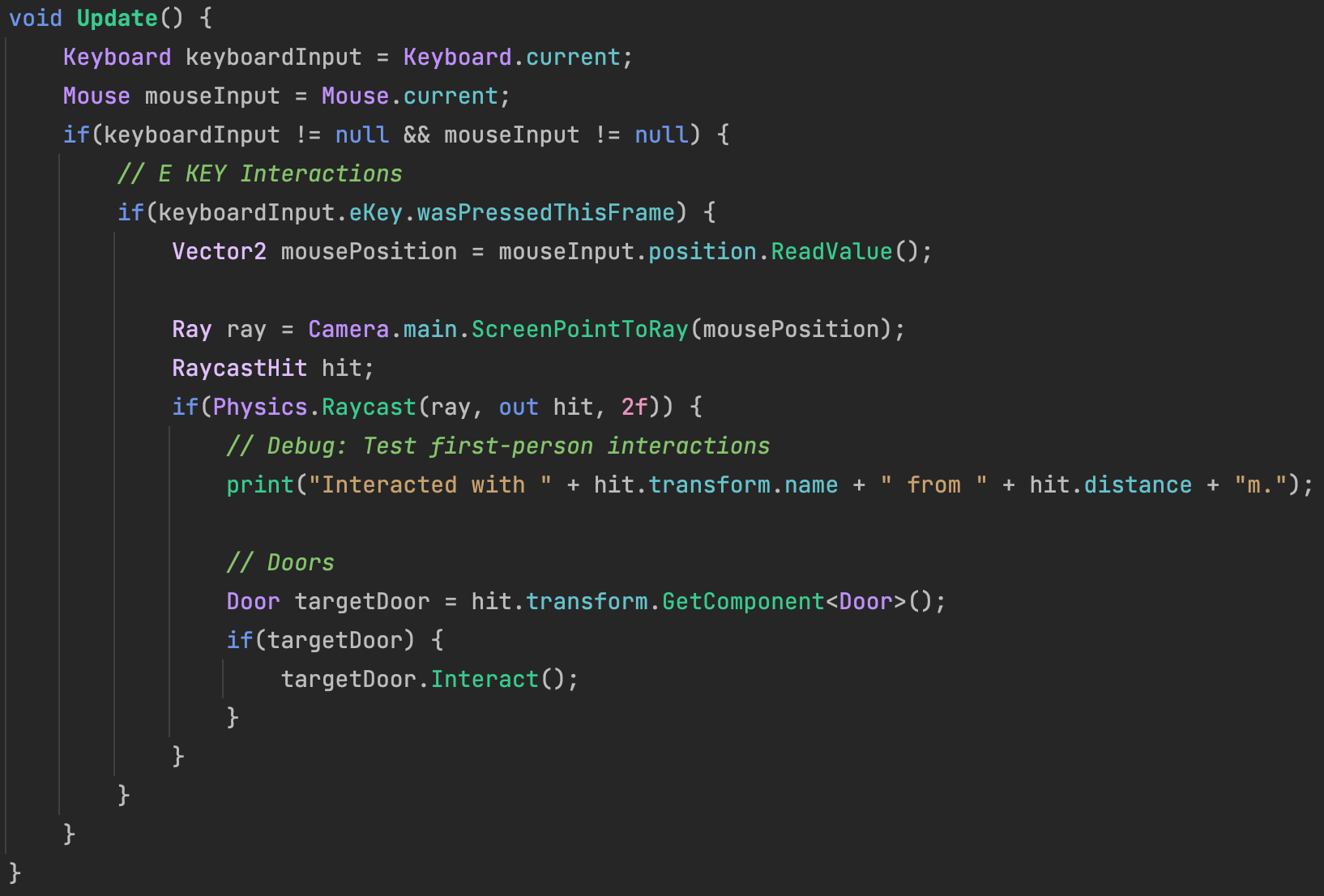 The PlayerController will check if the interacted object has a Door script and will trigger it accordingly.
