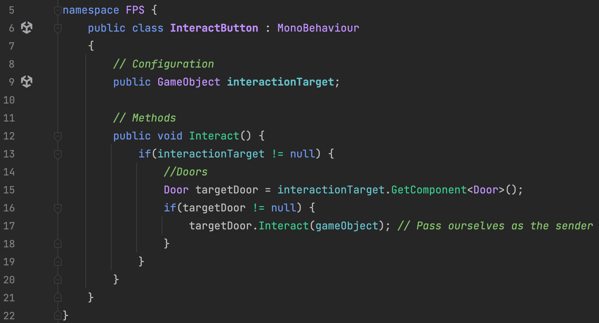 Create and attach an InteractButton.cs component to the Button gameObject.