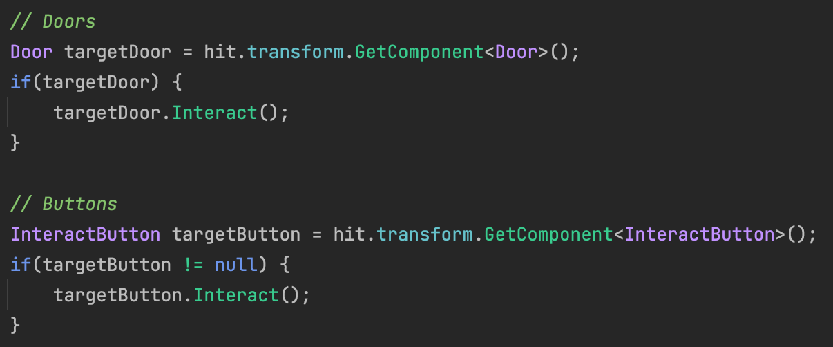 Expand the available PlayerController interactions to include the new InteractButton. Notice that the Door code remains unchanged because of the default argument value from earlier. All of our interactions will follow a similar pattern for maintainability.