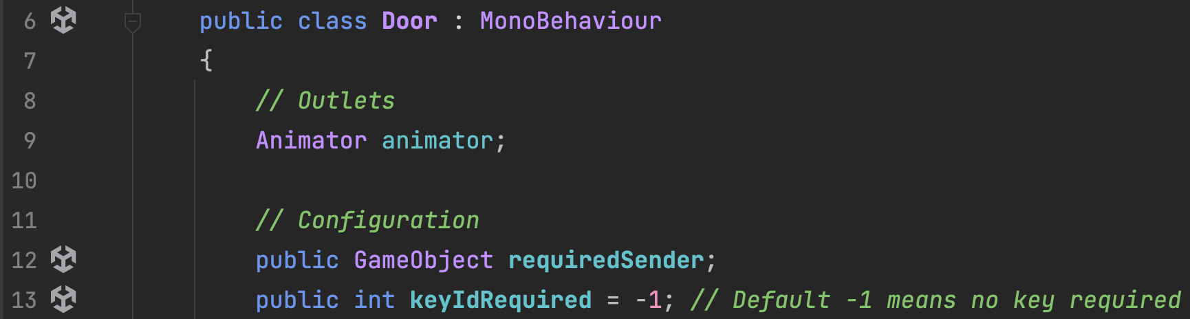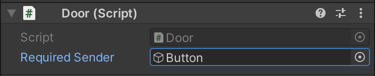 The Door code must be revised again to support this third interaction scenario (Key Required, No Button) without breaking the prior two interaction scenarios of Door 1 (No Key, No Button) and Door 2 (No Key, Button Required). Add another configuration value to the Door, so that it checks not only for senders, but also for collected keys.