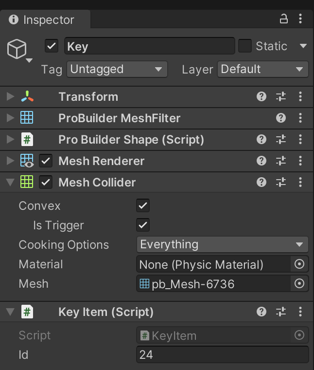 Note the Collider and KeyItem component configuration. Each key should be given a different ID.