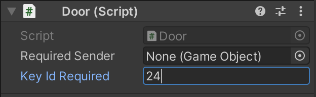 To avoid breaking the functionality of existing doors, the default key ID required value is set to -1, which is a value that will be ignored in the Door's Interact function.