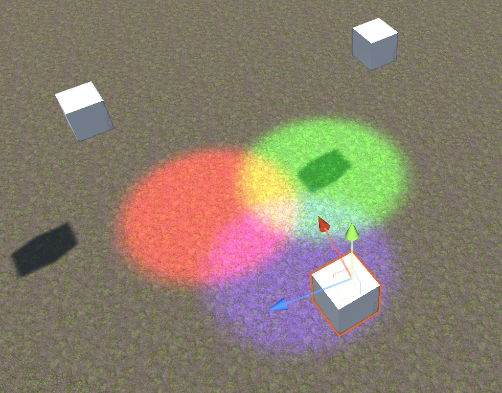Create three overlapping spotlights using 3 different colors. To each spotlight, attach an InteractLight.cs script.