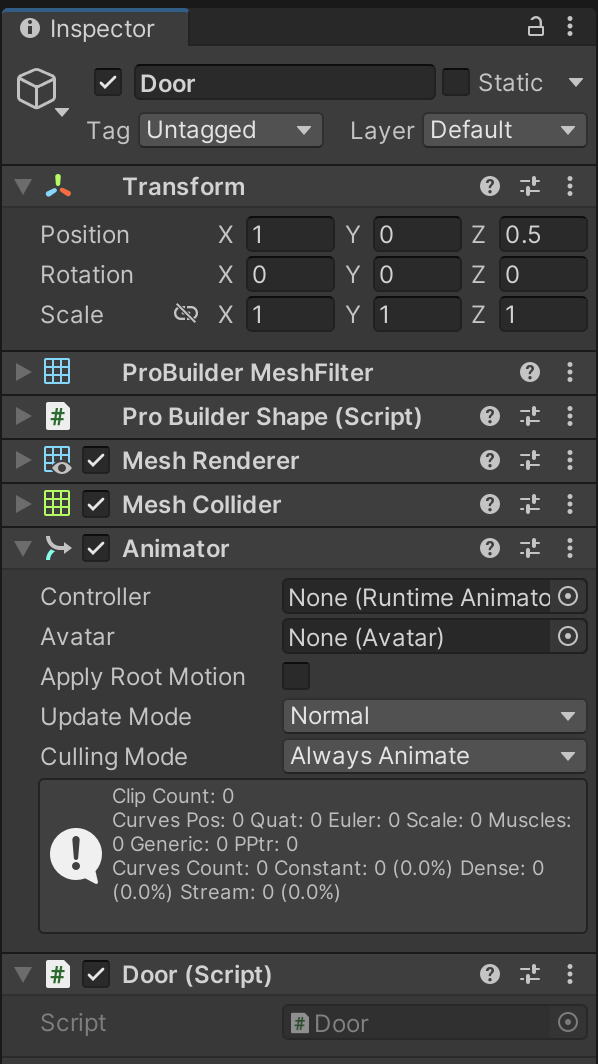 Add an Animator to the Door. Do NOT add it to the DoorWay. Also create a Door.cs script in /Assets/Code/Q4/ and attach it to the Door. Do NOT add it to the DoorWay.