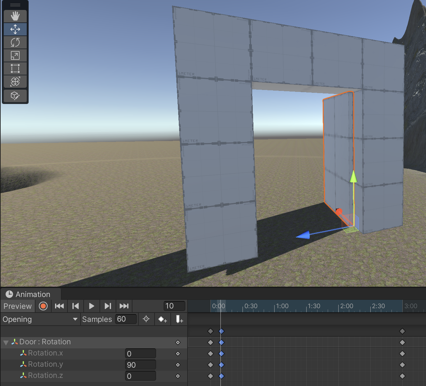 The Opening animation is the door in the process of opening using a Y-rotation. These doors will auto-close, so make sure the animation includes time in which the door stays open long enough for the player to walk through.