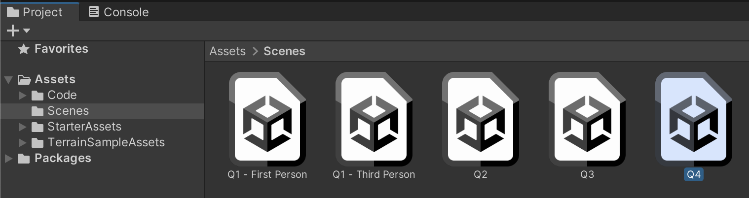 We will re-use all of the terrain and character setup from your prior assignment. Duplicate your Q3 scene and name it Q4. Make sure you have opened Q4 and are conducting your edits in the correct scene.