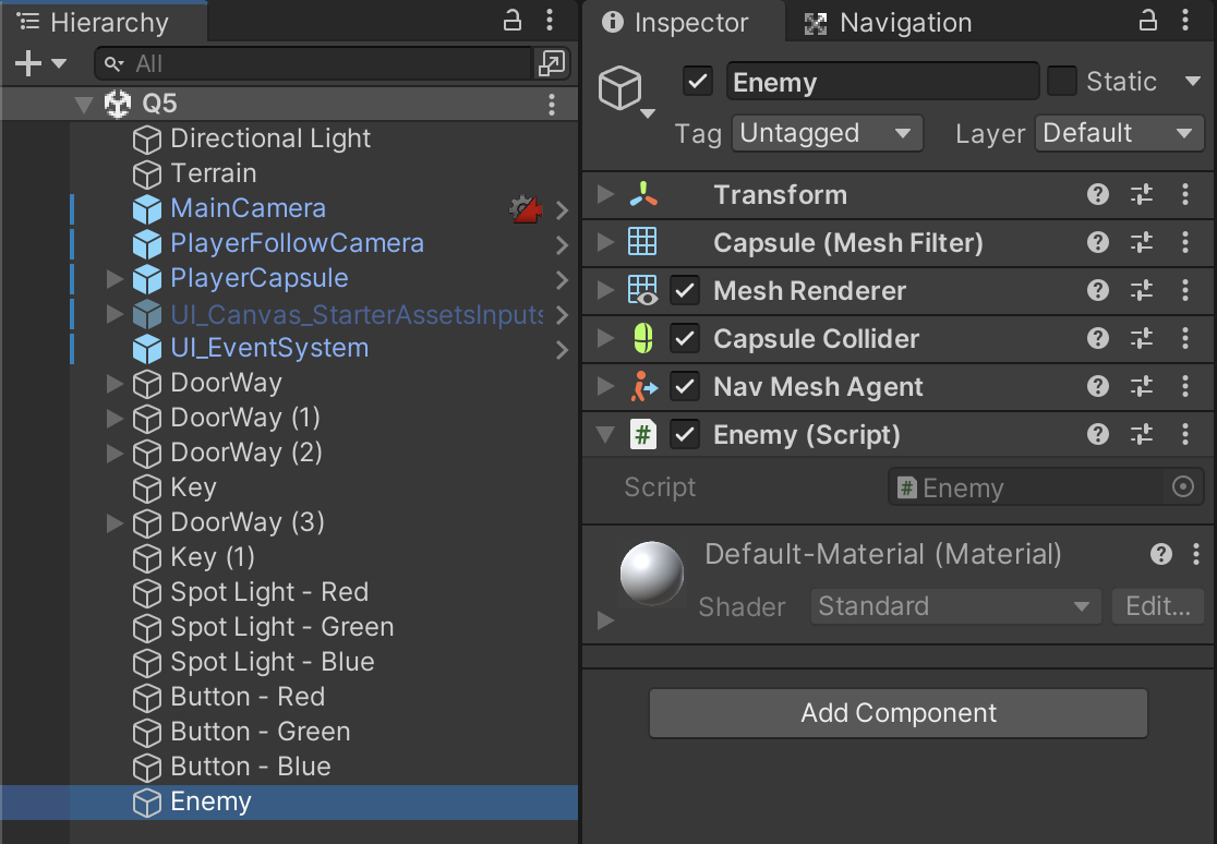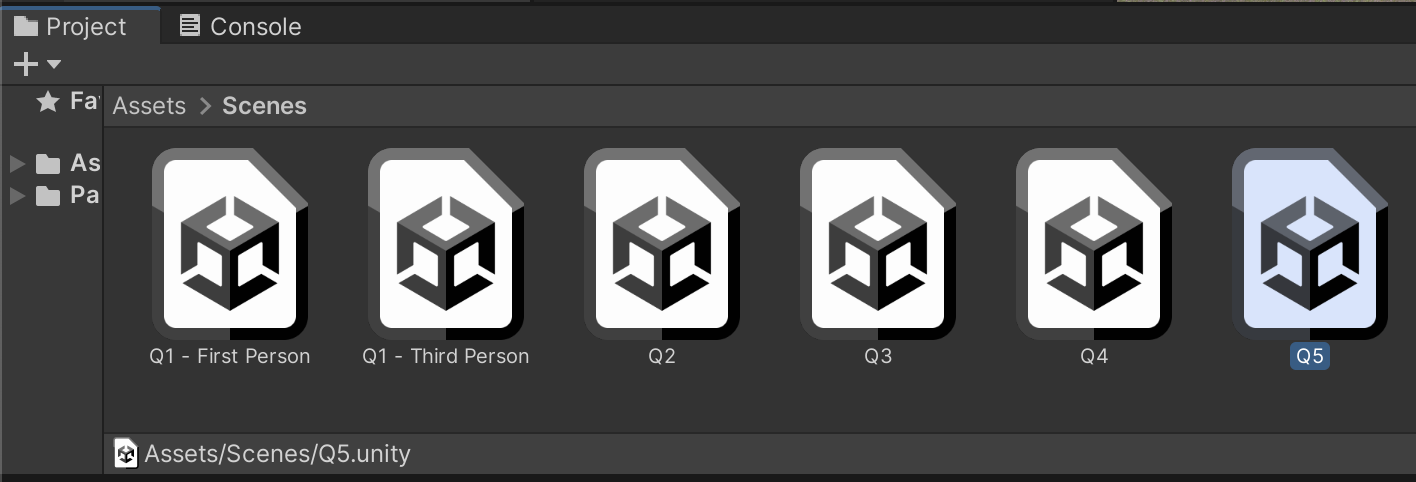 We will re-use all of the terrain and character setup from your prior assignment. Duplicate your Q4 scene and name it Q5. Make sure you have opened Q5 and are conducting your edits in the correct scene.