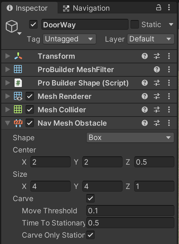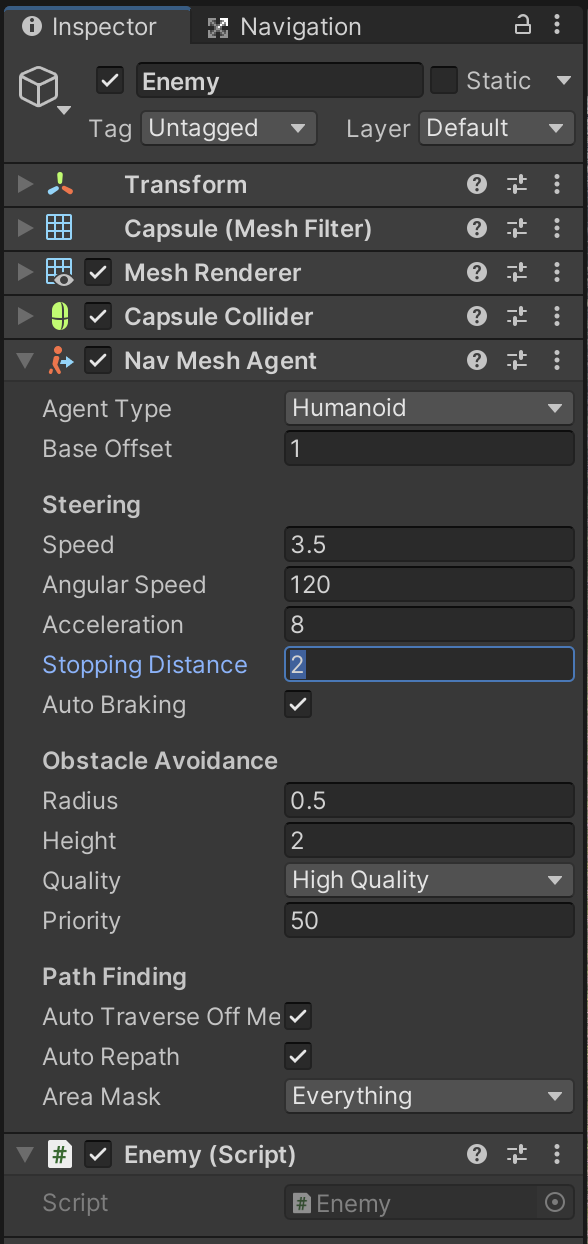 If you consider that a Rigidbody simulates physics for movement, a NavMeshAgent simulates intelligence for movement instead. On the NavMeshAgent component there are many settings that describe the movement capabilities of this object. A key settings we will change is the Stopping Distance to prevent this object from shoving us around the level as it tries to chase our character.