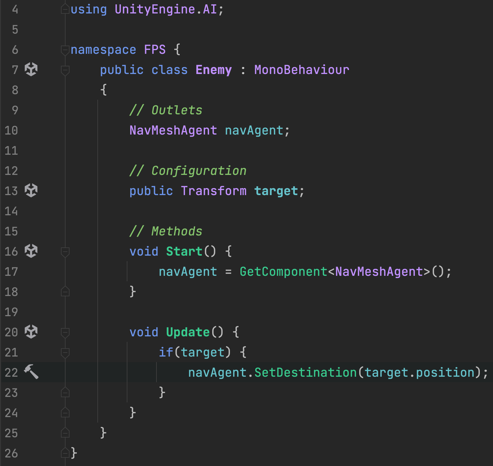 The Enemy script will pass a destination to the NavMeshAgent. In this example, we are updating the destination every frame in case the target is moving.