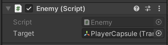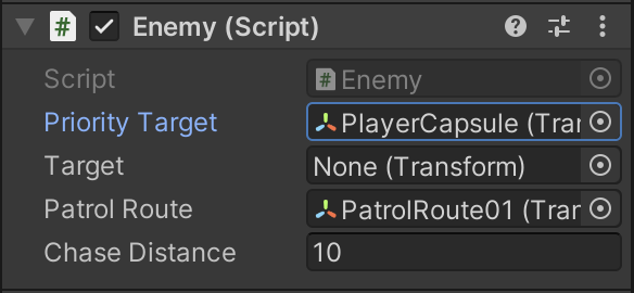 The player will be assigned as the priority target. (The target variable will change dynamically because of the patrol route.) A chase distance of 10 means if the player gets within 10 units of the enemy, they will be chased until they manage to get farther than 10 units again.