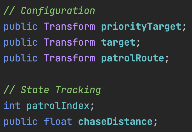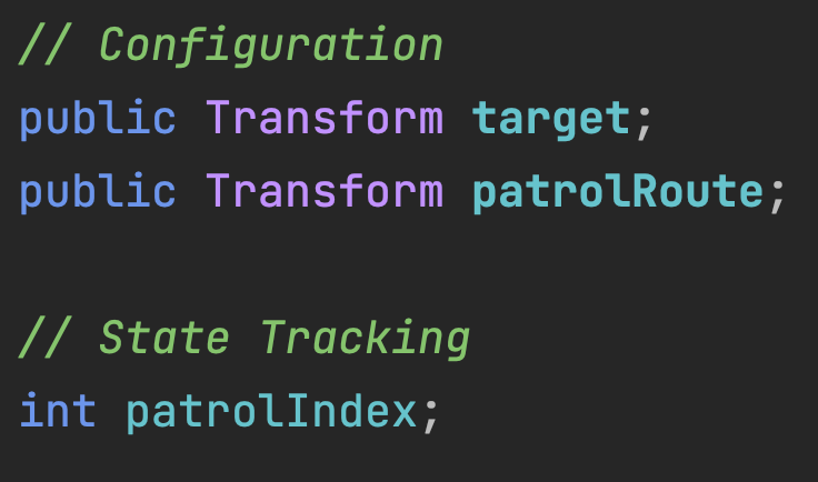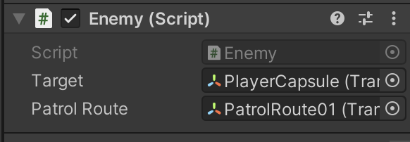 The Enemy.cs needs an outlet variable to tell it what object to use as a Patrol Route (whose children will be used as Patrol Points) and a state tracking variable to keep track of which Patrol Point we are currently tracking.