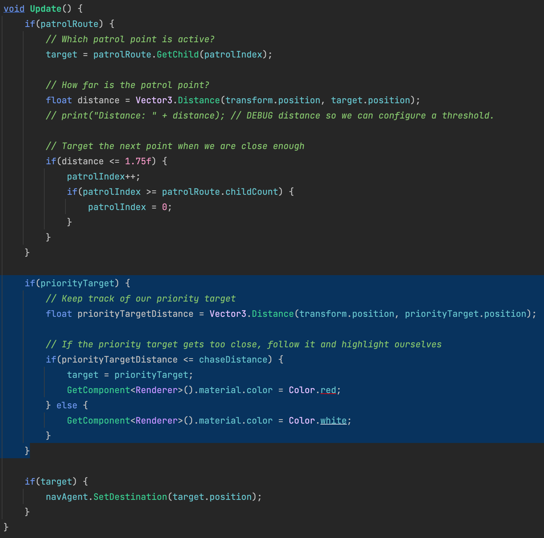 Finally, the patrol logic is refined with an extra condition that favors chasing the player if the distance conditions are met.