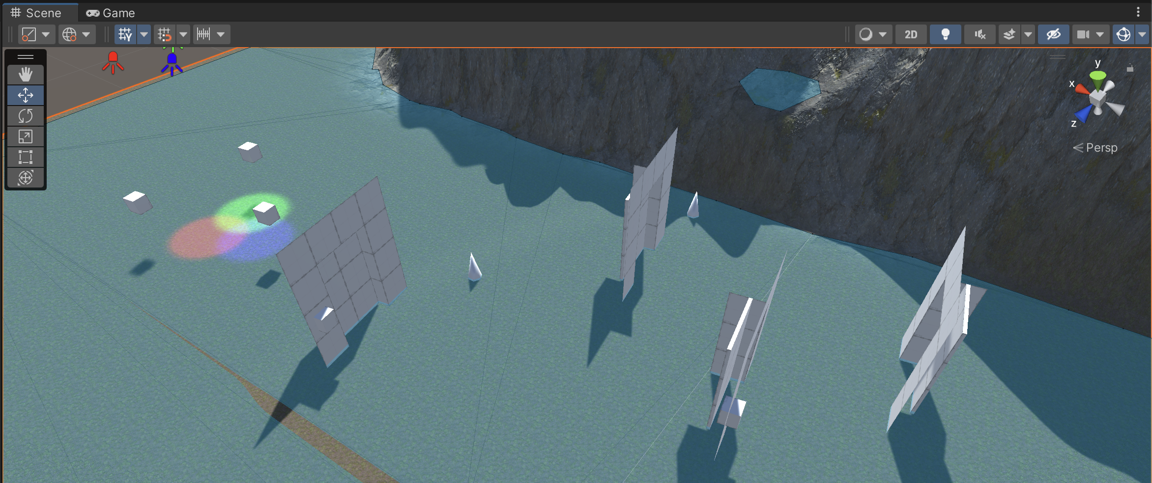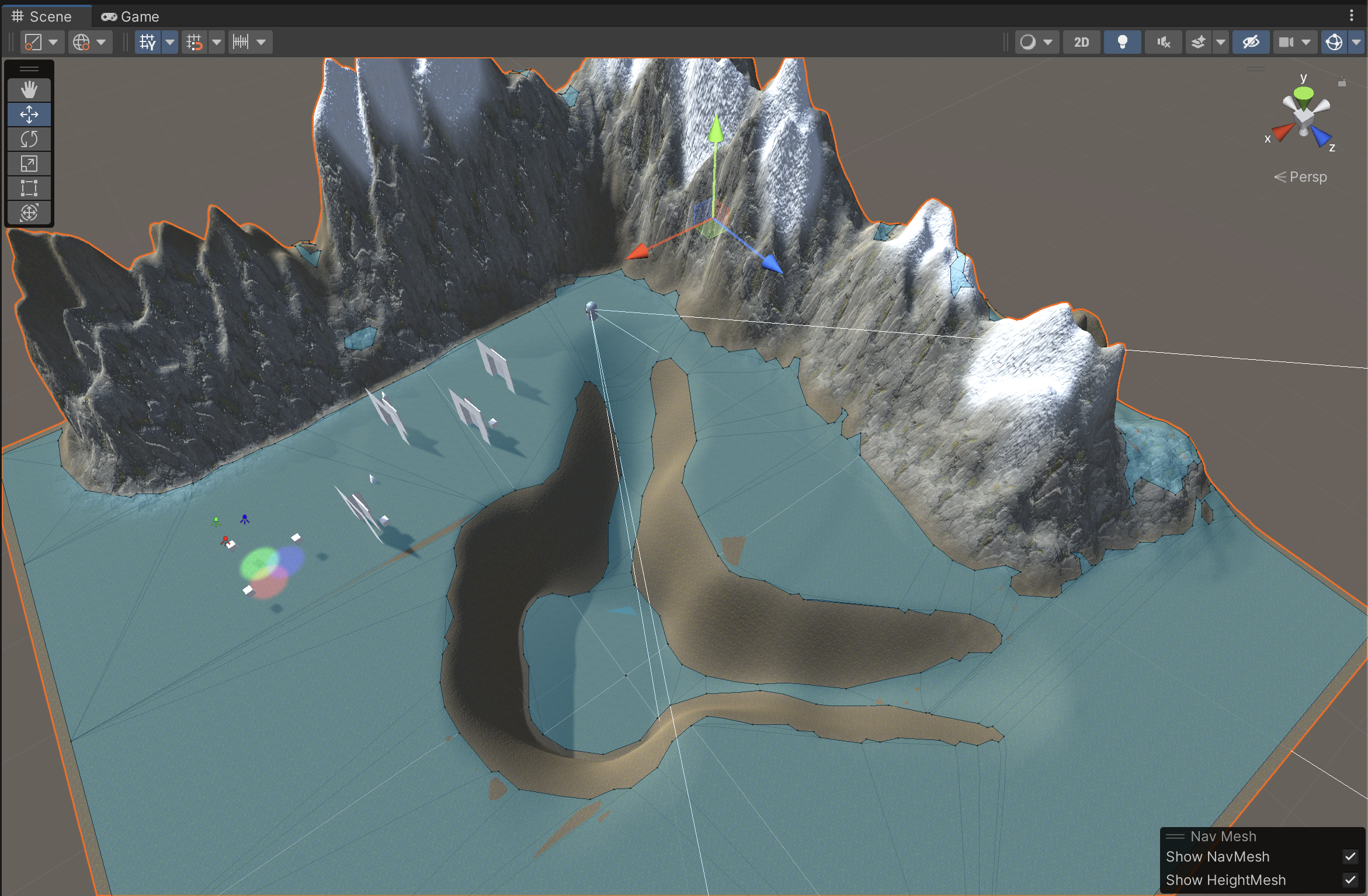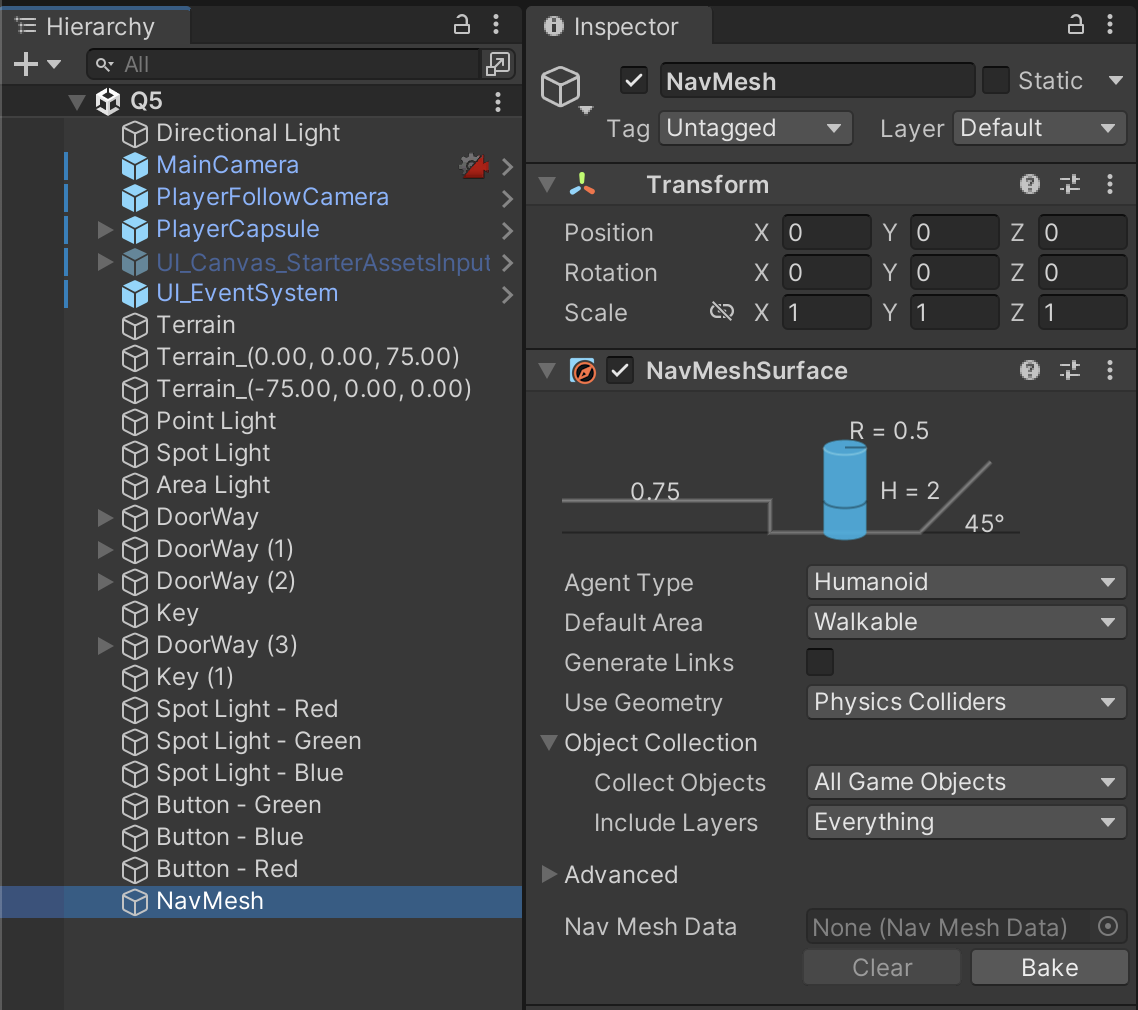 The NavMesh is a computation of what landscape is navigable by Unity’s built-in pathfinding AI. Compatible environments can include terrain or any other static mesh objects.