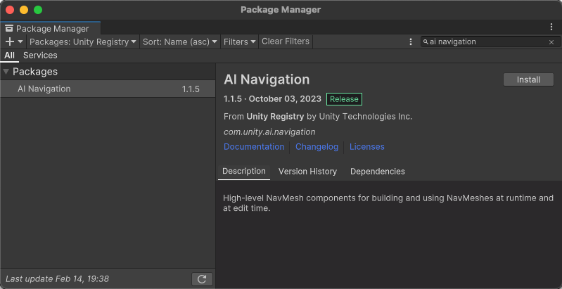 Open the Package Manager through Window > Package Manager. Make sure your Packages filter is set to Unity Registry. Find "AI Navigation" and install it.