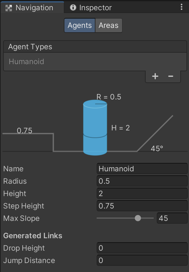 Open Window > AI > Navigation. The first section "Agents" is where you describe the different shapes of AI-driven characters who may need to navigate your environment. An agent's different sizes and capabilities affect its ability to navigate the terrain and will change the paths it chooses.