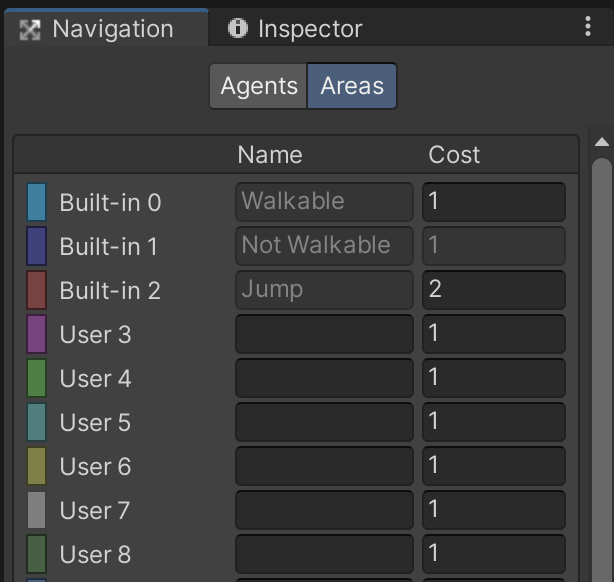 The second section is "Areas" which allows you to assign a traversal cost to different regions. For example, Normal "walkable" terrain may have a cost of 1, while "poison gas" environments may have a cost of 5. Despite the drastic difference in cost, there may be some circumstances where it is still more cost-effective to take a shorter route through a more costly area.