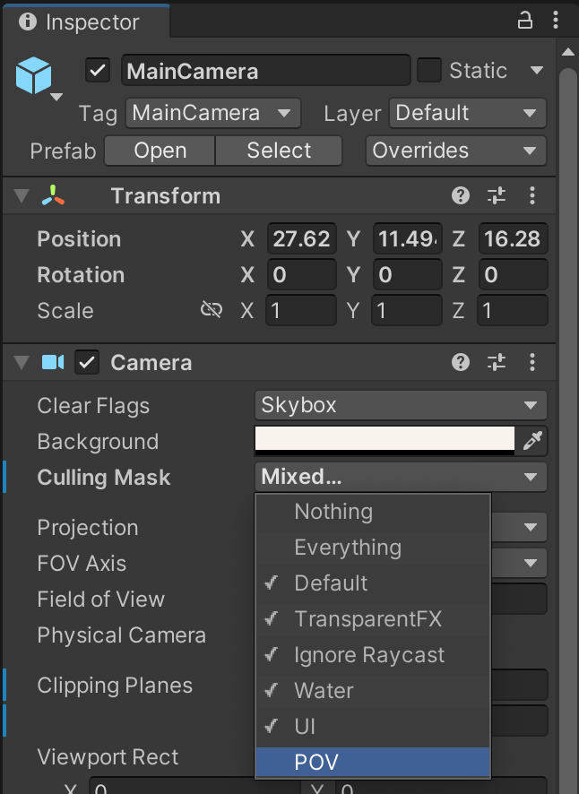 To control what layers each of the different cameras can see, update the MainCamera so that its Culling Mask excludes rendering the POV layer.