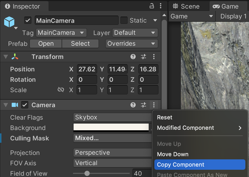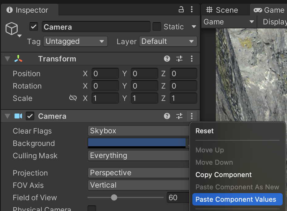 To make sure these two cameras line up perfectly, zero out the new Camera Transform’s position and rotation values. Remove the AudioListener component. Copy the values of the MainCamera’s Camera component and paste them into the new Camera’s Camera component using the triple-dot menu.