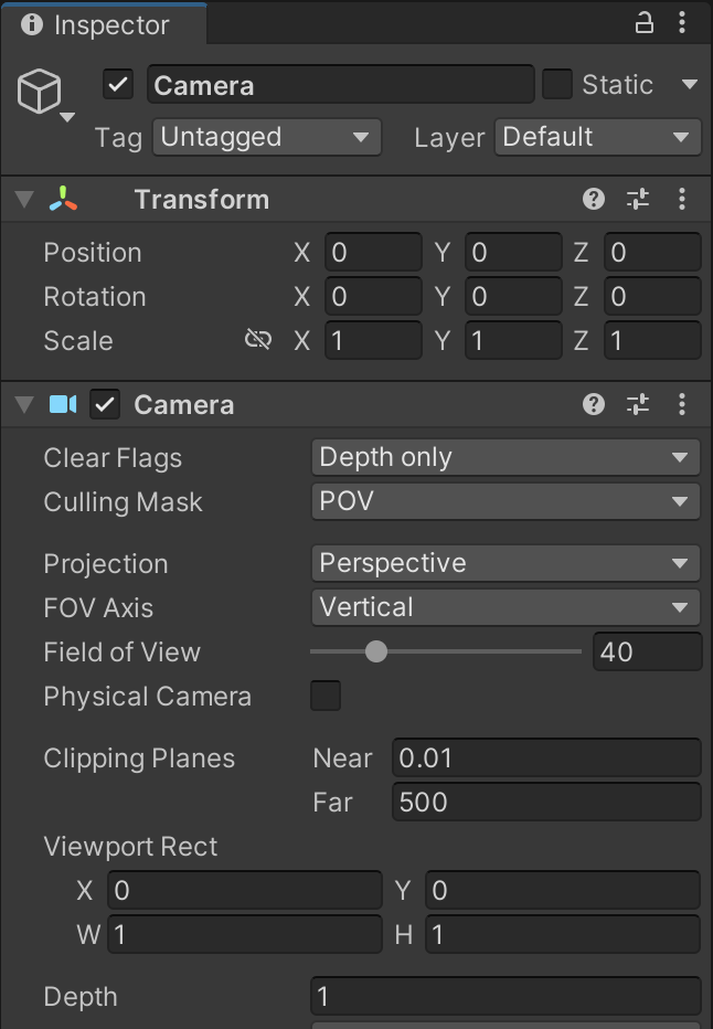 To fix this, we will actually make use of 2 cameras layered on top of each other. The existing camera will handle environmental objects, and a new camera will render point-of-view (POV) first-person objects on top like an overlay.