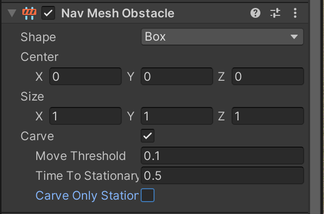 To make sure the cubes work with the existing AI NavMeshAgents in the scene, add a NavMeshObstacle to each of the cubes. The cubes should always be carving the baked Nav Mesh.