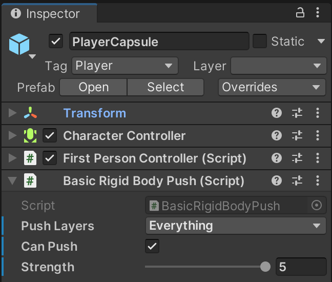 The PlayerCapsule from the Unity Starter Pack needs additional settings in order to push environmental physics objects.