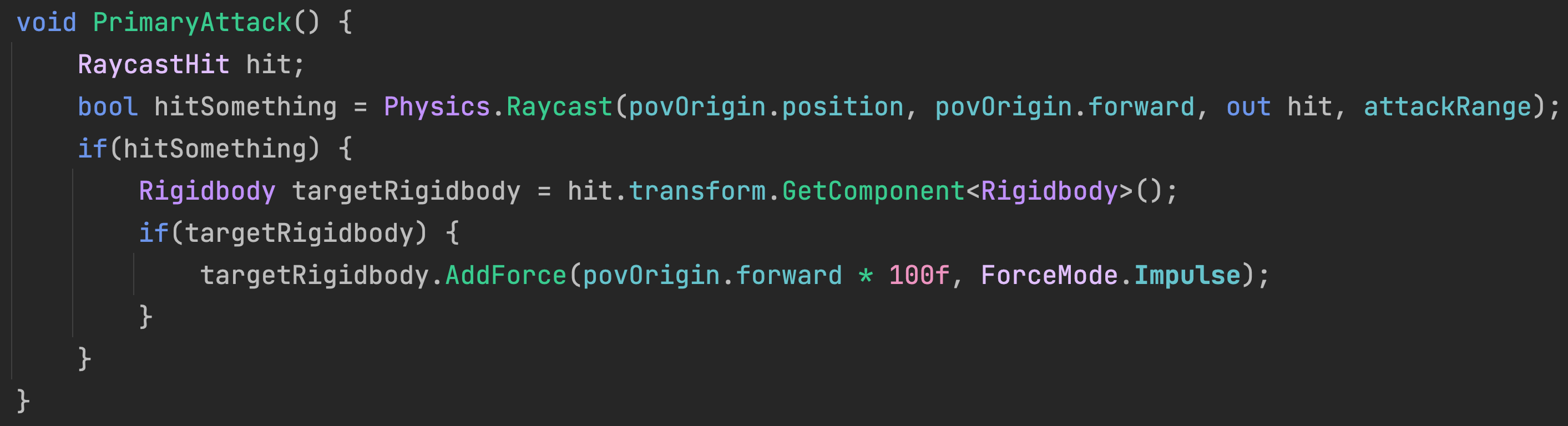 The PrimaryAttack function raycasts from the source perspective in the direction faced by the player for the configured range. If an object in range is hit by our attack and has a rigidbody, it will be shoved in the direction of the attack.