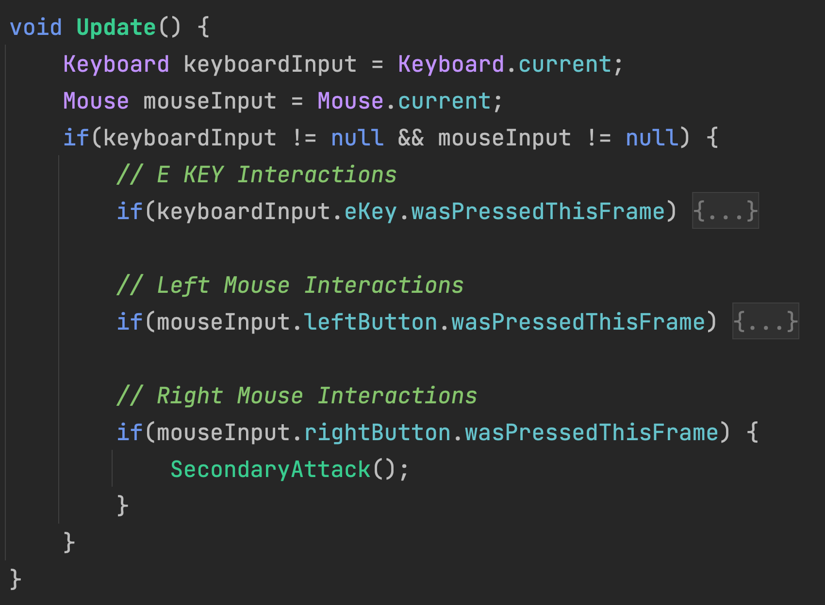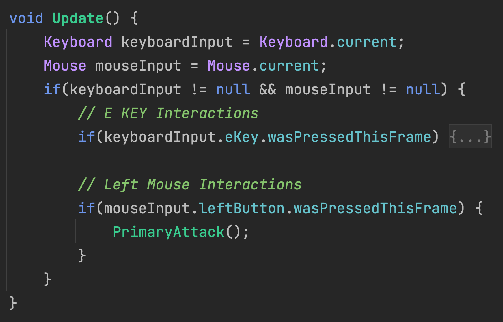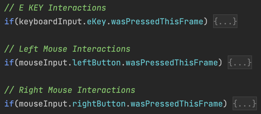 While this is functional code, this approach is not ideal for when players may need to reconfigure keys for their unique physical needs or when a game will be released on a platform that doesn't have the same inputs as PC keyboard and mouse. Using Unity's new input system, it is possible to configure game interactions to adapt to whatever input devices are available or even multiple input devices at the same time.