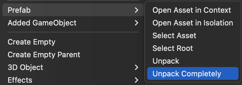 Right-click the Rifle in our scene and completely unpack the prefab. This will detach the Rifle from the prefab template and give us more freedom to break it into separate objects.