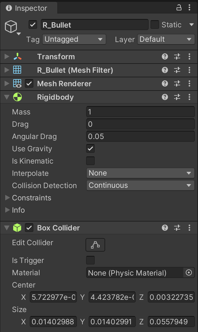To make the bullet usable in our game, revise the bullet prefab with a Rigidbody and Collider. Because it will now be used as an environmental object, change it's layer back to Default instead of POV.