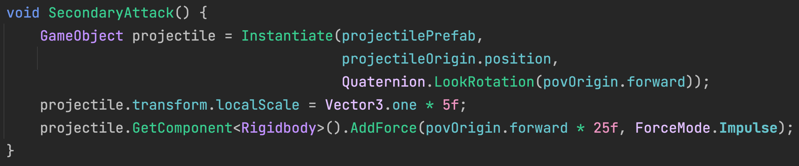 The SecondaryAttack function in PlayerController will instantiate the prefab at the projectile origin point and send it forward using physics. For easier visualization, this attack function exaggerates the size of the projectile by scaling it up.