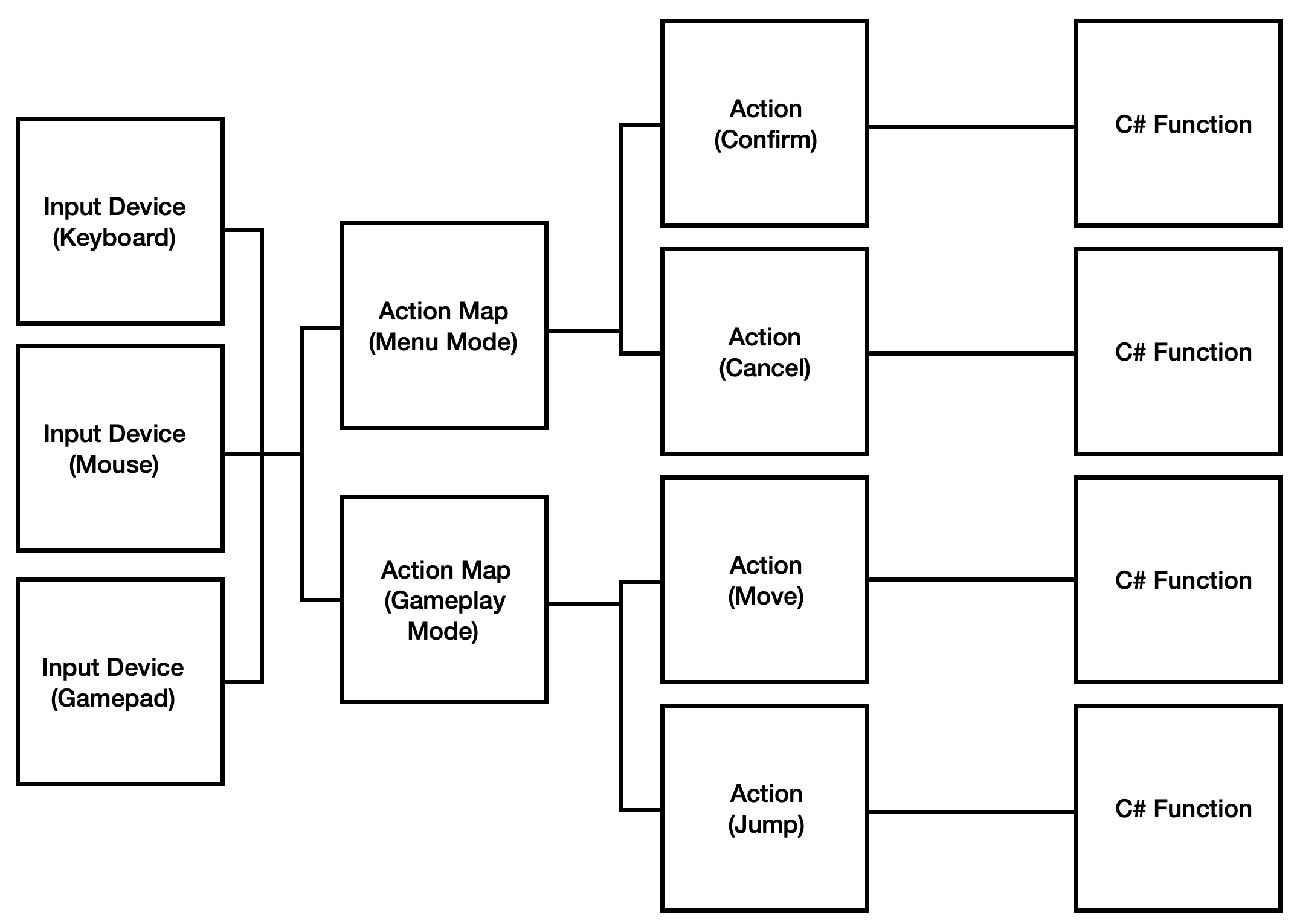 Abstracting gameplay inputs as actions is a way to make a game's controls hardware-agnostic. To avoid hardcoding to only one input, Unity's new Input System abstracts interactions as actions which can trigger different functions. Instead of your code waiting for the E key, for example, it waits for the Jump Action before triggering the Jump Function.