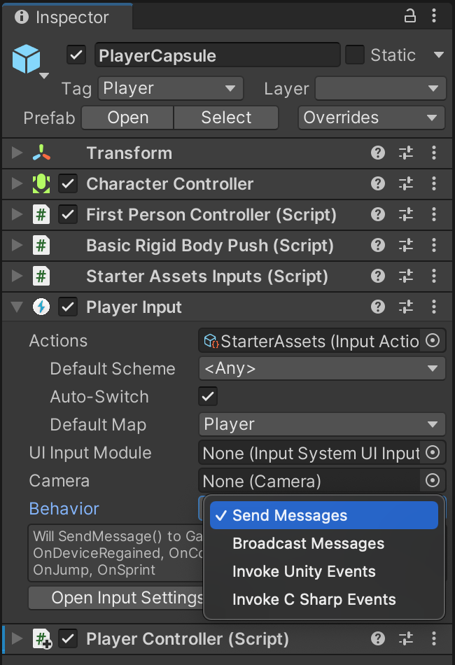 All four approaches are valid, but because the Unity First-Person Starter Pack is already using the second ("messaged events") approach, we will update our code to work the same way. Notice how our PlayerCapsule, which came from the Unity Starter Pack, already has a PlayerInput component. A PlayerInput component is required on any game object that wants to use the action mapping system. You can also see that the component was already configured to use the "Send Messages" approach of triggering events.